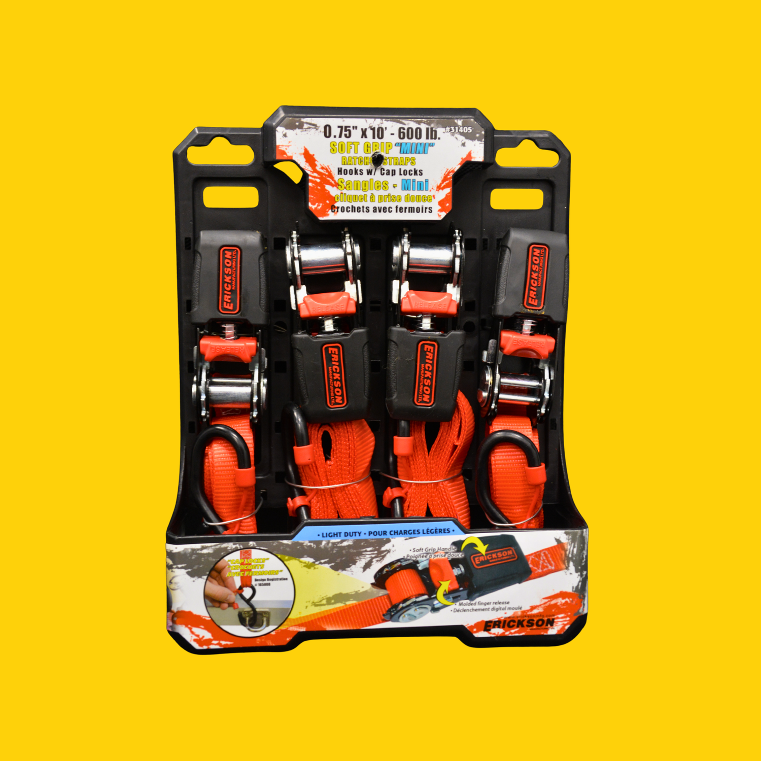This Erickson Ratchet Strap pack is perfect for light-duty load securement and comes in a convenient pack of four. Each 3/4-inch strap includes vinyl-coated hooks, a comfortable rubber handle, durable polyester webbing, and offers a 600 lb breaking strength with a 200 lb working load limit.
