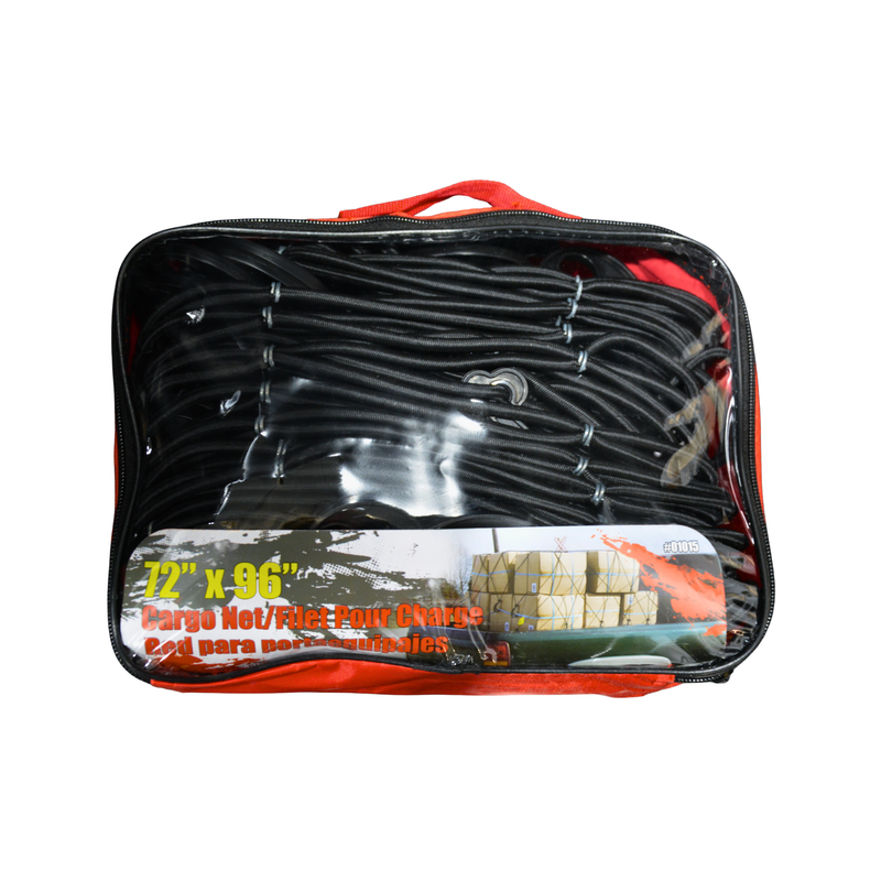Keep your load secure with this heavy-duty Erickson 72" x 96" Cargo Net. Designed with durable rubber strands covered in polypropylene, it stretches and adjusts to provide a snug, reliable fit over your cargo. The polycarbonate molded hooks feature built-in latches for added security and easy attachment.