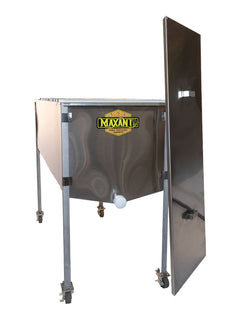 The solution for uncapping and frame storage. Uncap directly into the removable cappings basket, remove capping spike when finished, and cover with lid. Let your cappings sit and drip dry in the sloped drain tray. The bottom is pitched to the center and to the front of the tank to drain honey completely. Our tank will hold 20 frames with the basket in place, or 31 frames without the basket. 100% stainless steel.